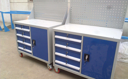 如工具柜頂部需放置小型工具或零件,可選配頂柜,頂框的材料為2mm冷軋鋼板,四周折邊高度為25mm,配黑色帶條紋防油膠墊。